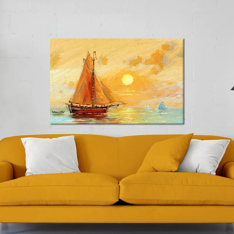 Elegant Canvas: Sunset Seascape with Fishing Boats