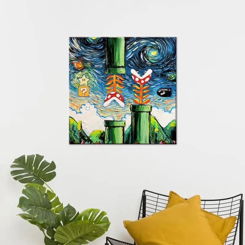 Super Mario World Starry Night Canvas - Van Gogh Gaming Room Art