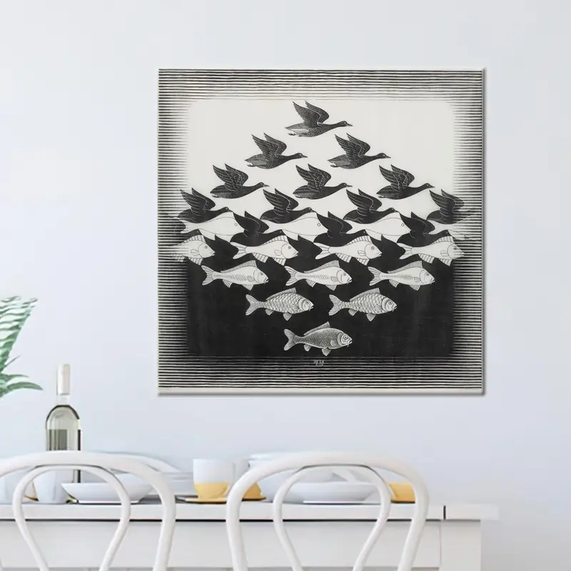 Abstract Black & White Canvas: Escher, Fish, Bird Art Print