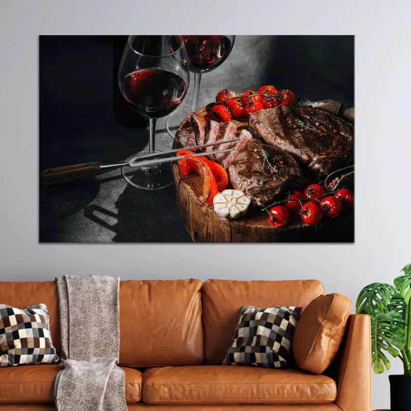 Elegant Printed Canvas: Gourmet Meat & Wine Kitchen Art