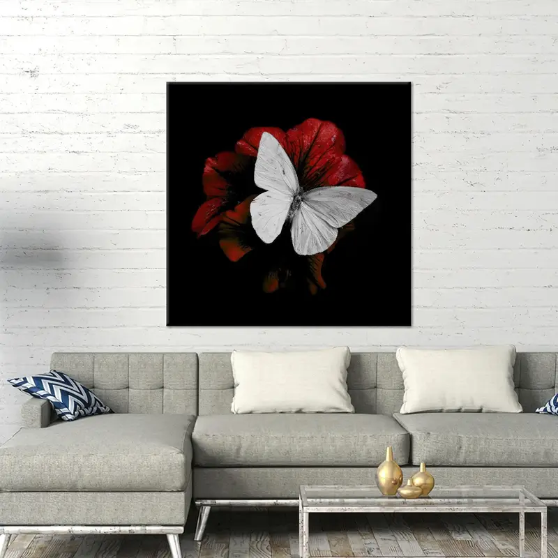 Modern Luxury Canvas: White Butterfly, Red Flower, Black
