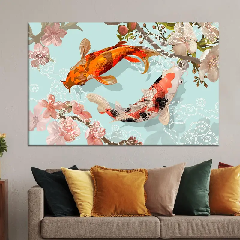 Modern Japanese Koi Fish Canvas: Zen Floral Abstract Art