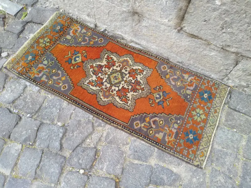 Green Rug, 1,42x3,33 ft with Orange Accents