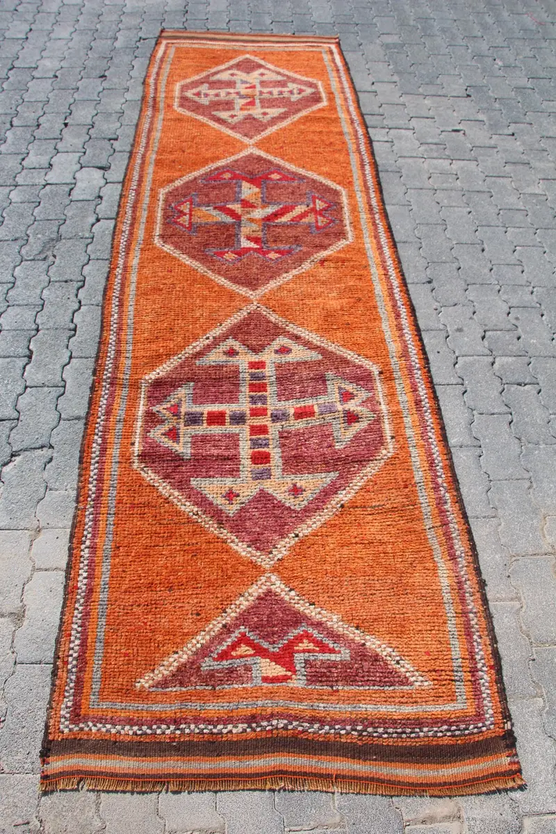 Orange & Purple Rug, 2,9x10,8 ft Geometric Floral Design
