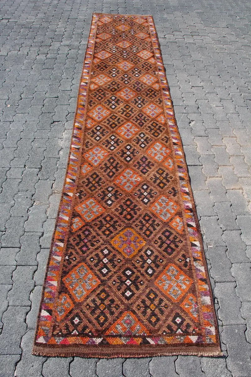 Brown Abstract Rug, 2,7x13,4 ft with Orange Accents