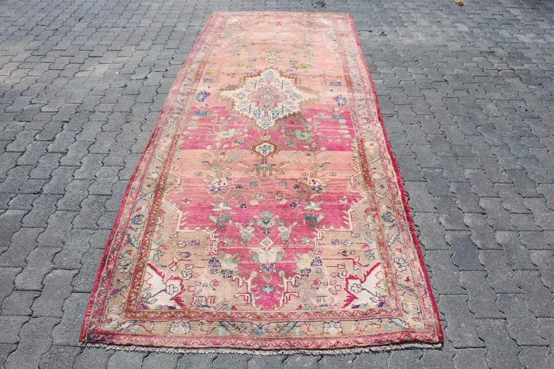 Elegant Beige & Pink Check Rug, 3,9x10,6 ft