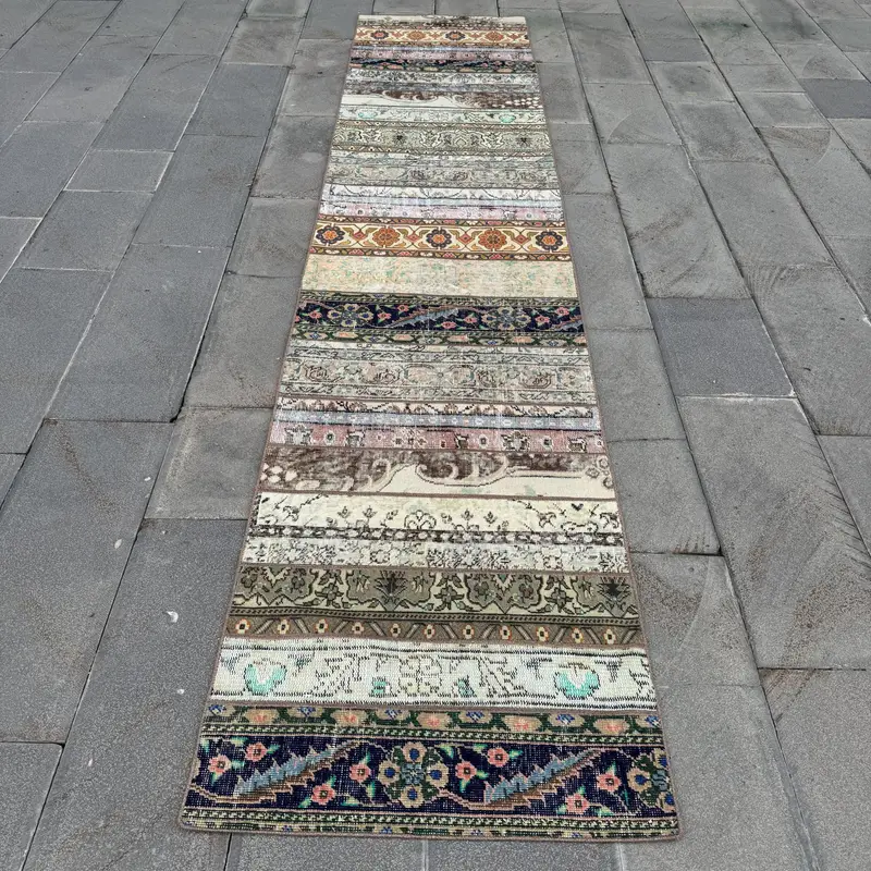 Beige & Green Patchwork Rug, 2.6x12.1 ft Elegant Decor