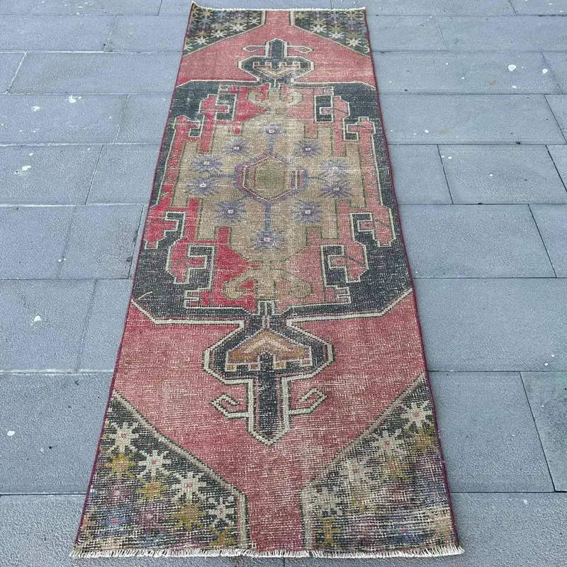 Pink & Black Rug, 2.6x7.4 ft Botanical Design