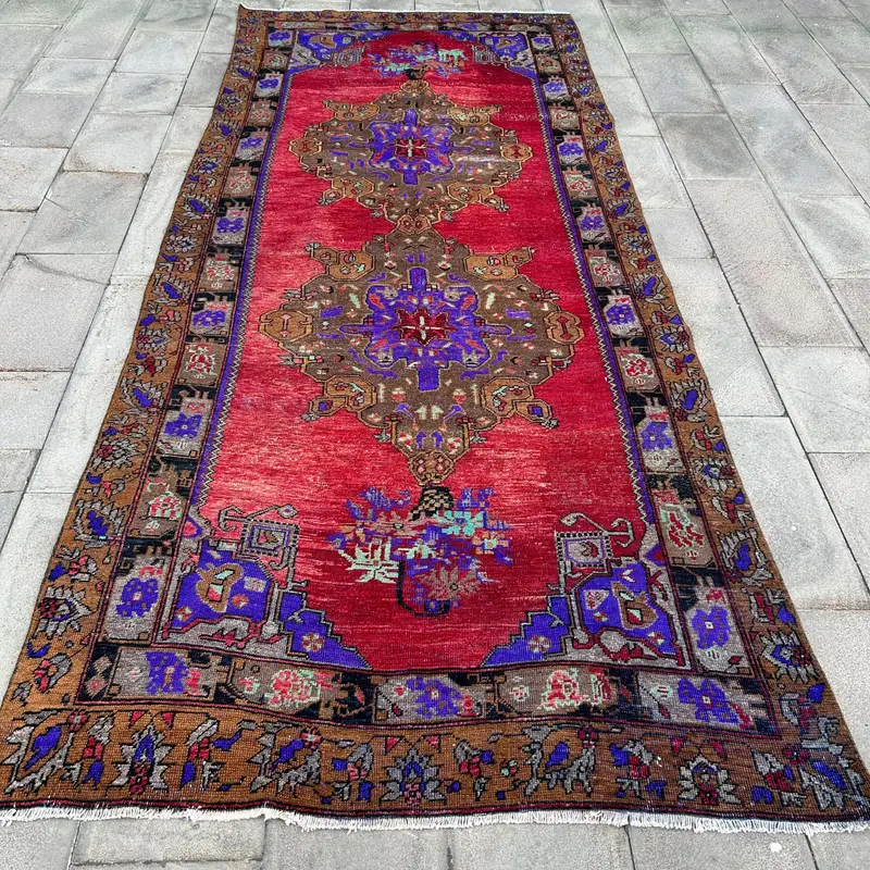 Red & Purple Rug, 5,1x11,9 ft Striped Geometric Design