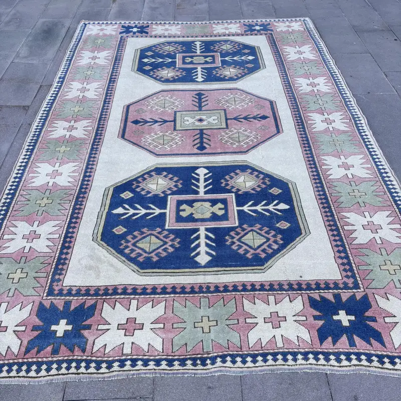 Elegant Beige & Blue Rug, 6.7x10.1 ft Bordered Design