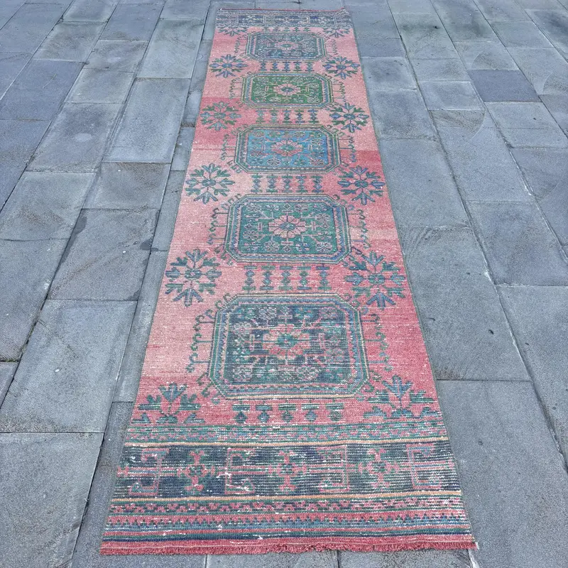 Red Moroccan Rug, 2,9x11,5 ft with Green Accents