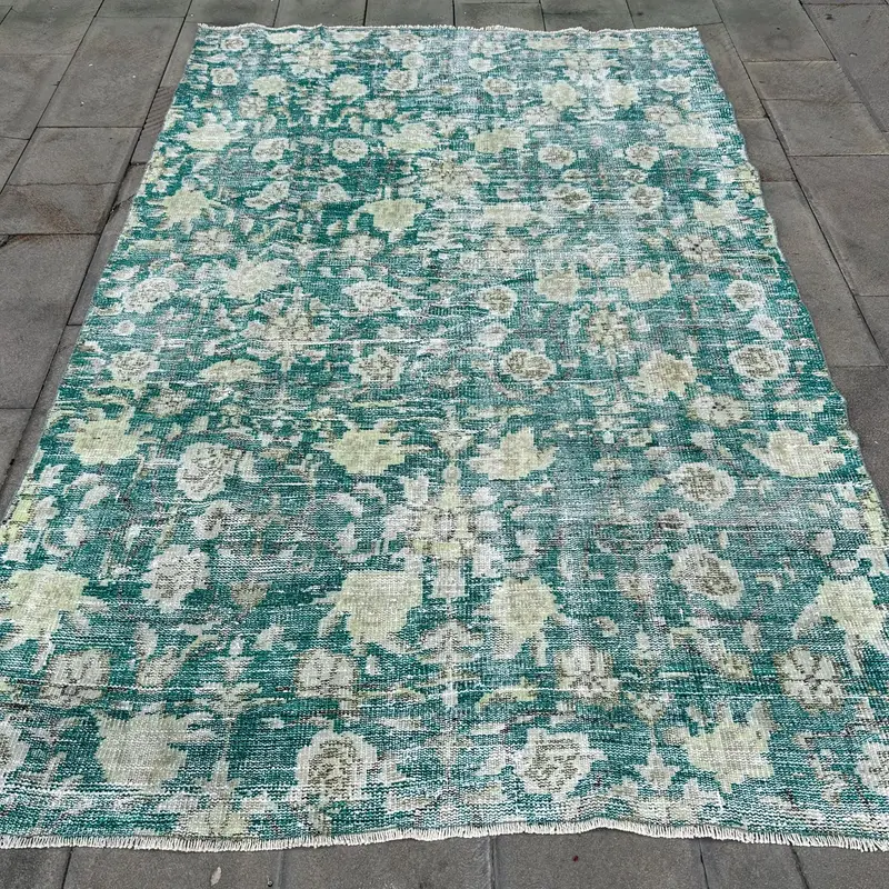 Green & Beige Rug, Geometric Floral Motifs 5,5x8,4 ft