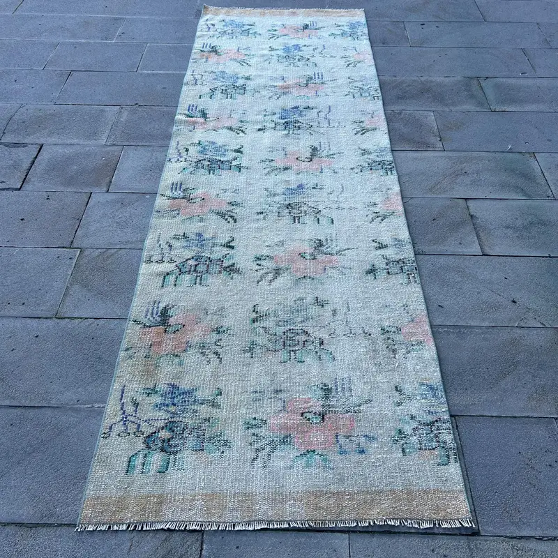 Elegant Beige & Pink Floral Rug, 1,7x9,3 ft Chic Decor