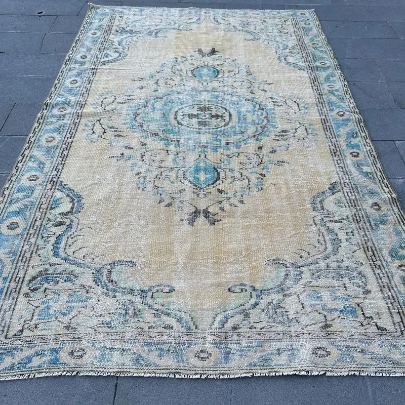 Elegant Beige & Blue Rug, 6,2x9,8 ft Striped Geometric Design