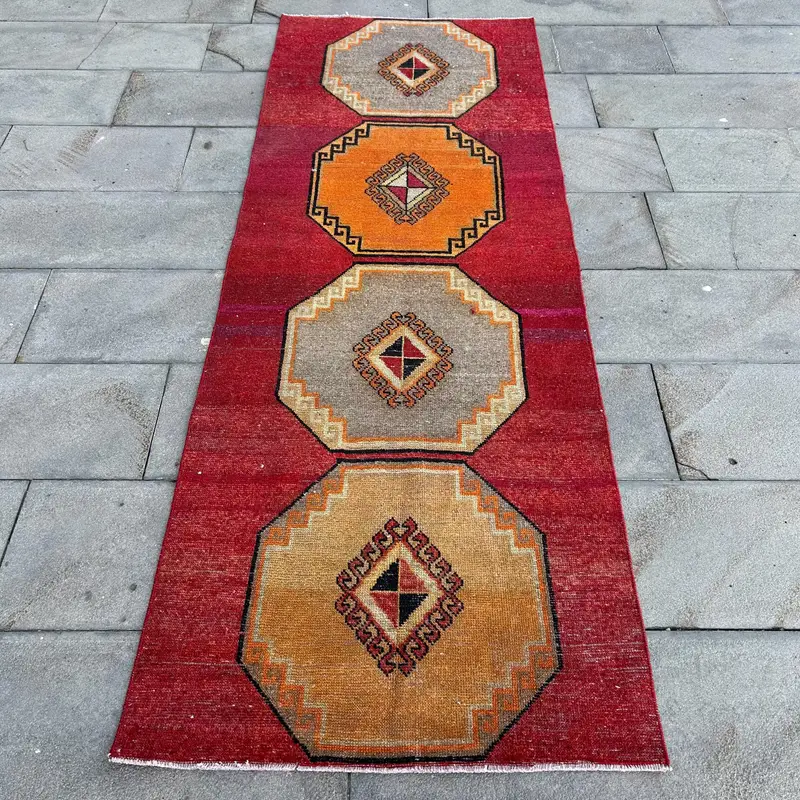 Orange & Red Rug, 2,8x7,8 ft Geometric Floral Design