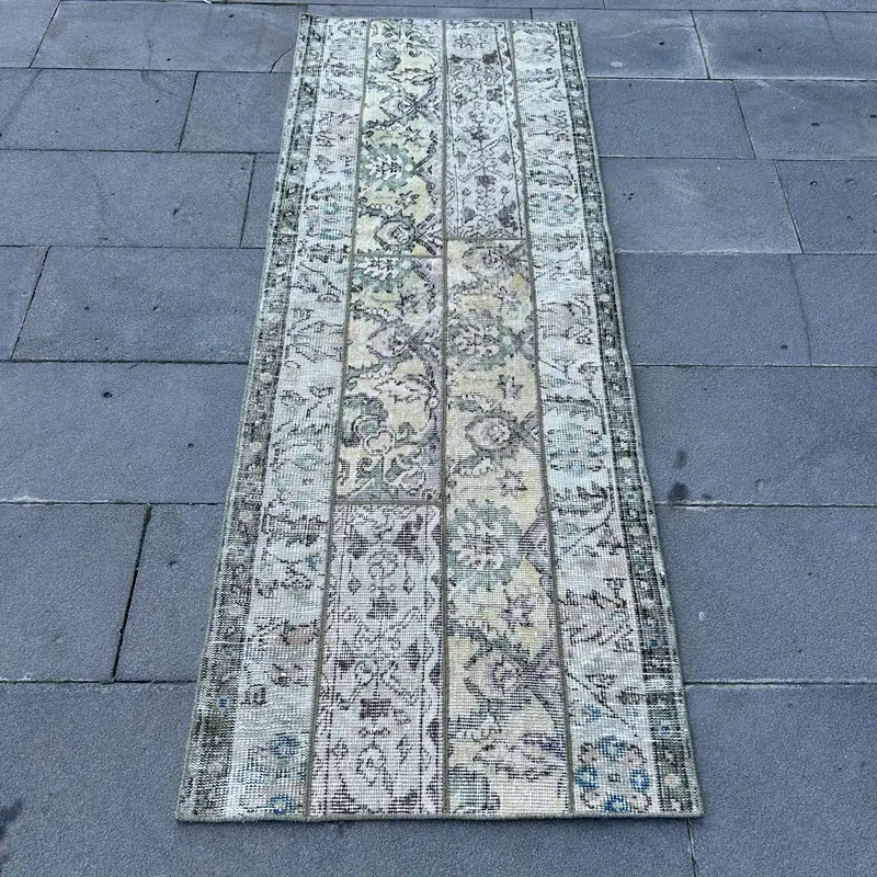 Green, Beige Rug, 2.4x6.4 ft, Geometric with Floral Motifs