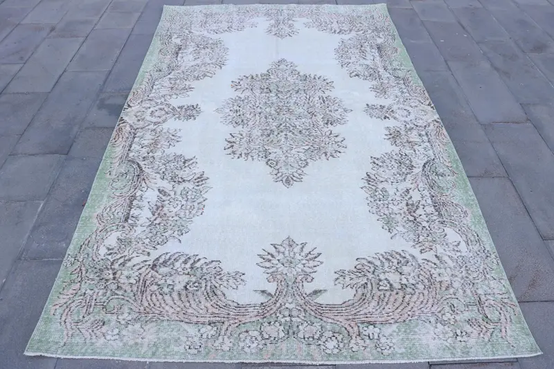 Elegant 5,5x9,3 ft Beige Ikat Rug, Chic Green Accents
