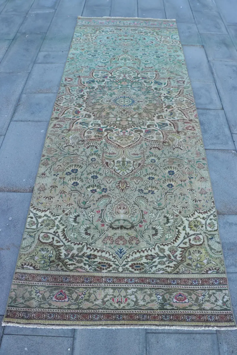 Elegant Green Oriental Rug, 3,3x9,5 ft with Brown Accents