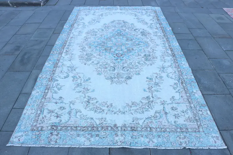 Elegant Beige & Blue Rug, 5,6x9,8 ft Geometric Floral