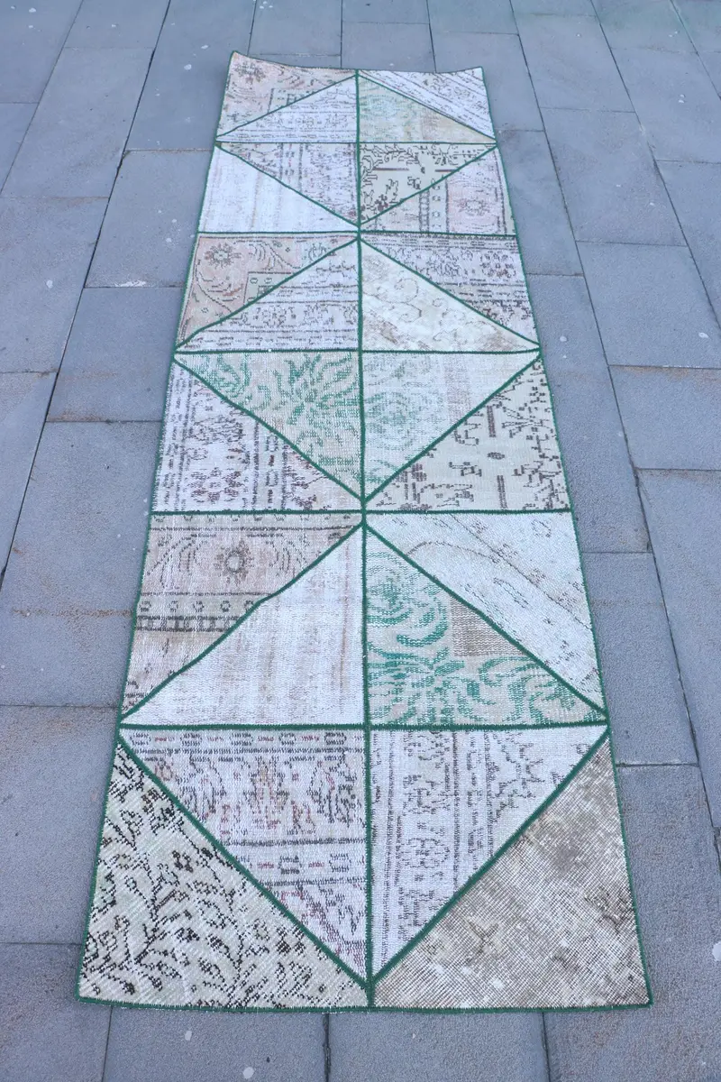 Elegant Green Patchwork Rug, 2,7x8,5 ft Chic Decor
