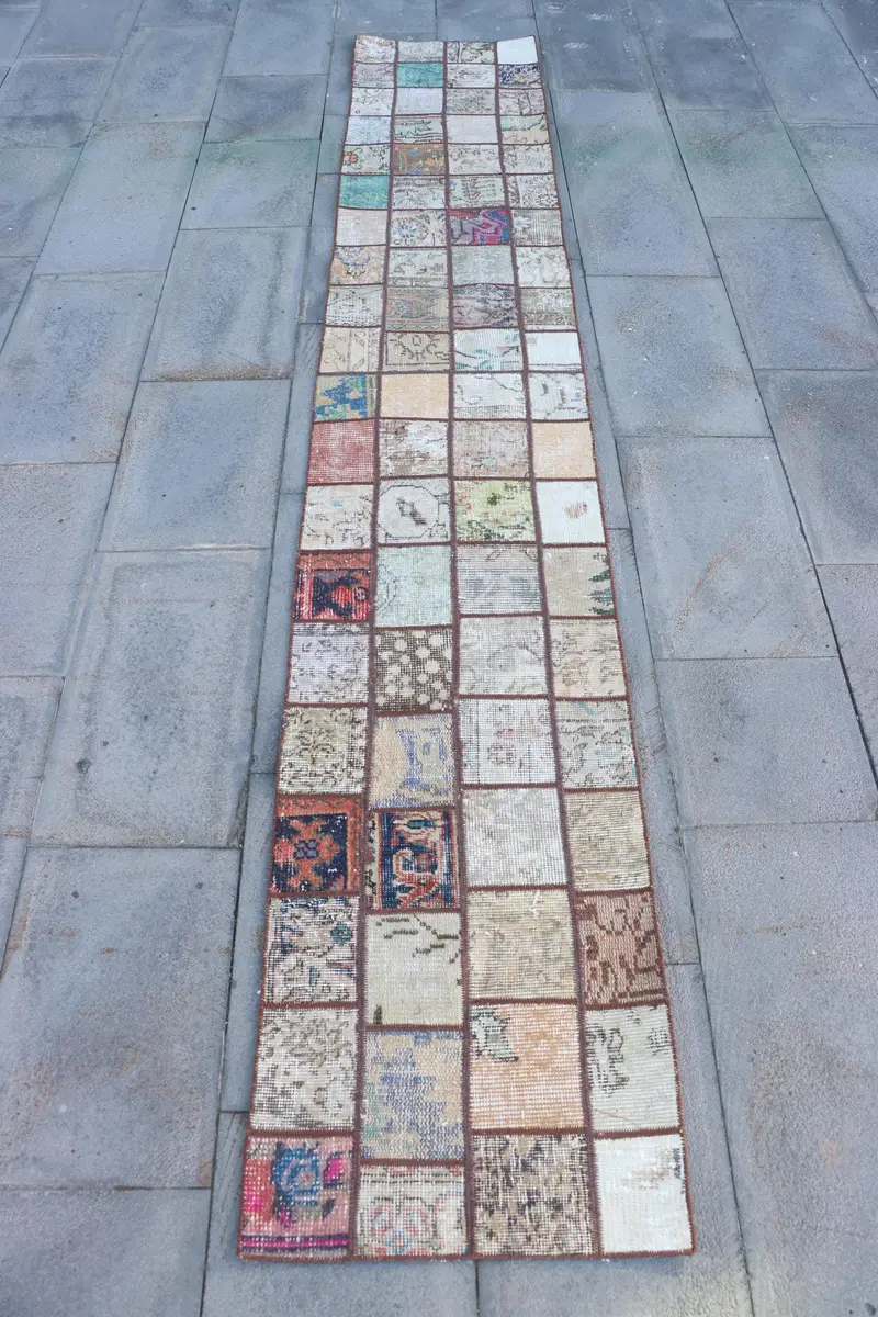 Elegant Beige Rug, 1.7x10 ft Striped with Geometric Shapes