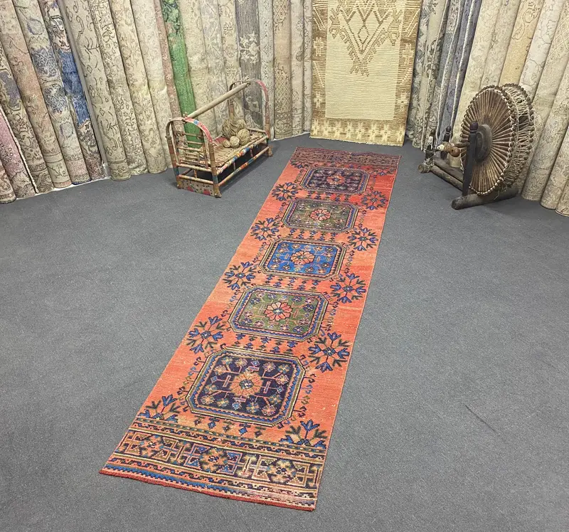 Red and Blue Floral Rug, 2,7x11,1 ft Elegant Decor