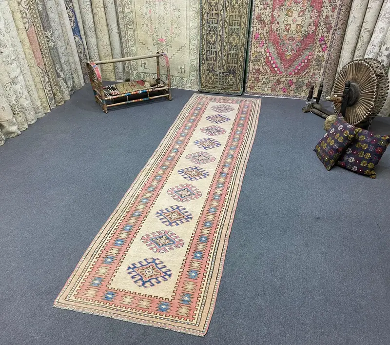 Elegant Pink & Blue Rug, 2,9x10,8 ft Floral & Geometric
