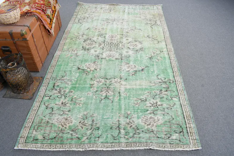 Green Geometric Rug, 4,5x8,1 ft with Floral Motifs