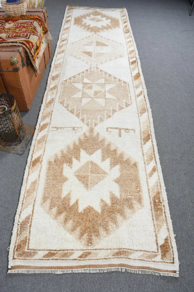 Elegant White & Brown Rug, 3x12.2 ft Floral & Geometric