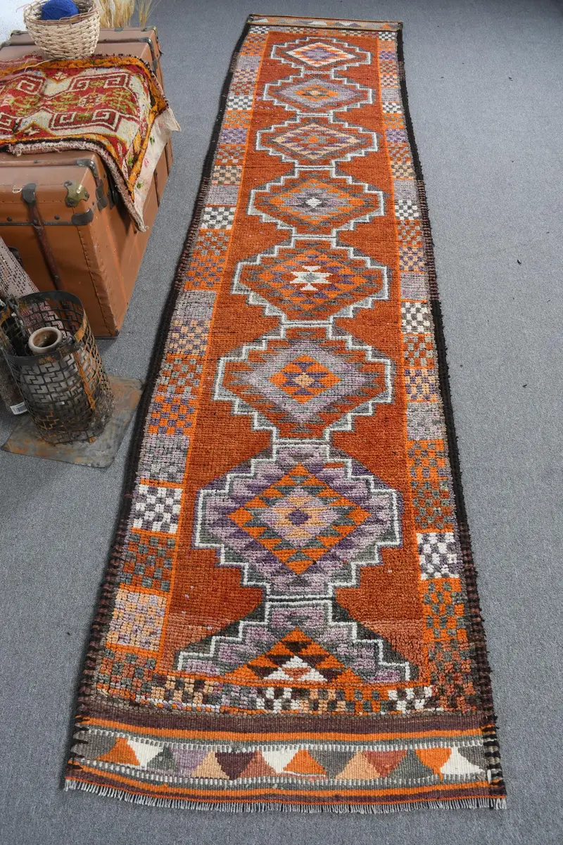 Brown & Orange Rug, 2.7x12.1 ft Striped with Geometric Shapes