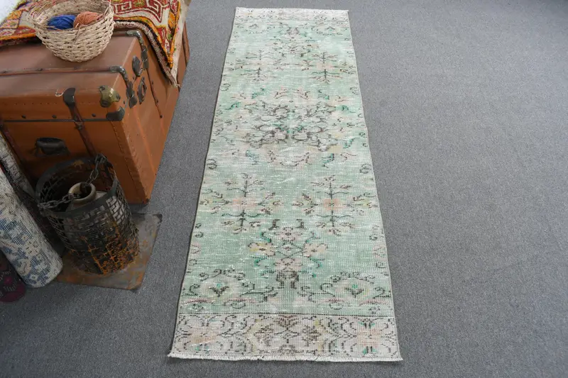 2,1x6,6 ft Green Rug with Geometric Floral Motifs, Unique Design
