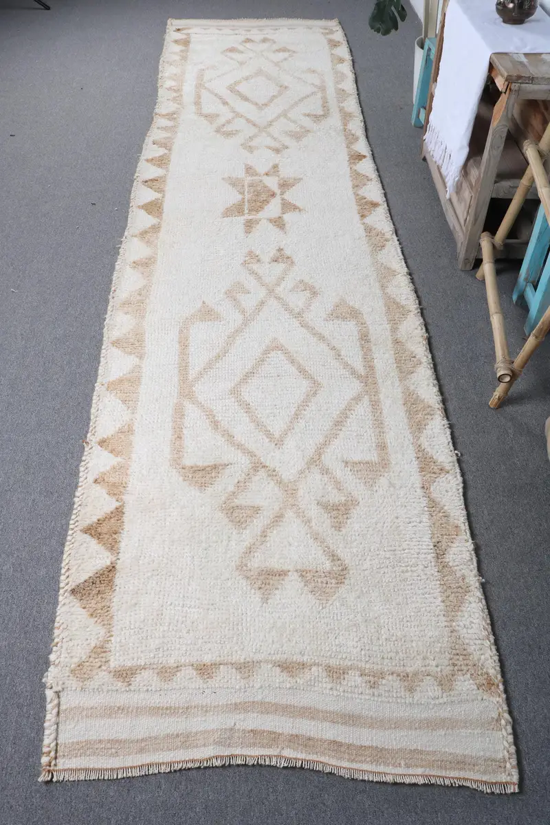 Elegant White Rug, 2.9x12.3 ft Solid with Brown Accents