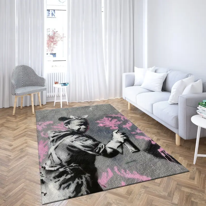 Gray And Pink Banksy Street Girl Graffiti Printed Rug