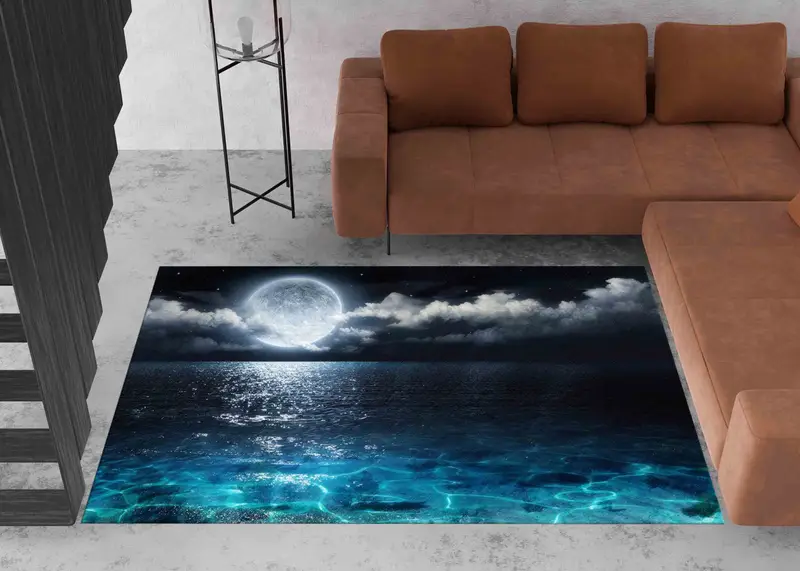 Moon View Sea Landscape Printed Rug, Modern Full Moon Design