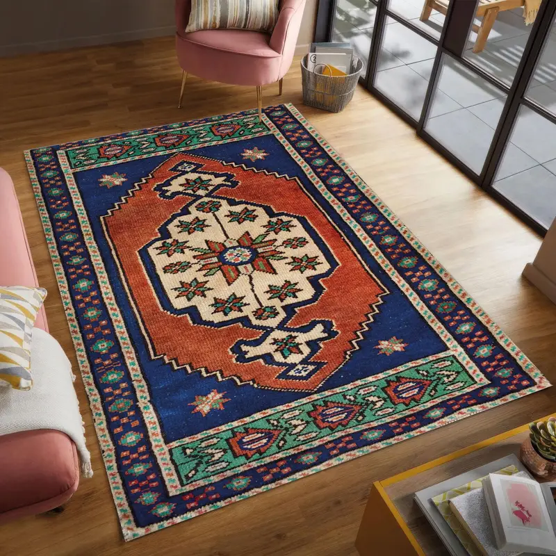 Medallion Blue Boho Vintage Printed Rug, Coastal Geometric Pattern