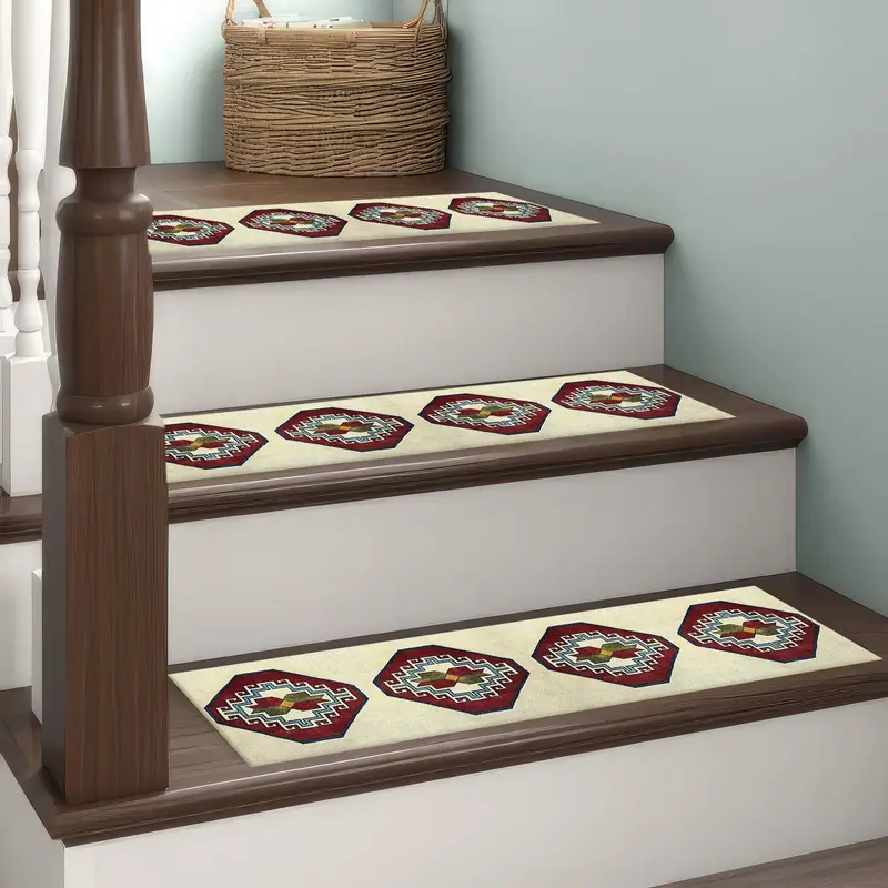 Beige Navajo Pattern Printed Step Rug, Ethnic Geometric Design