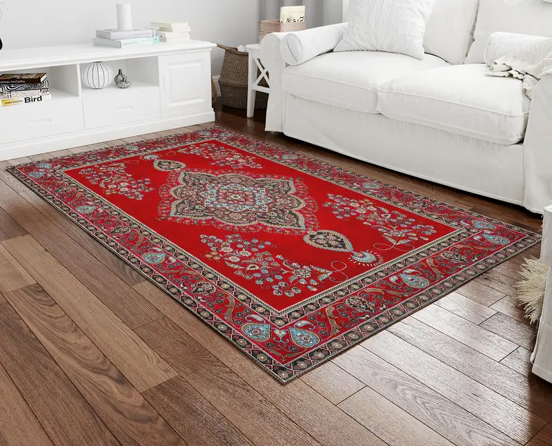 Red & Blue Floral Vintage Pattern Printed Rug - Timeless Elegance