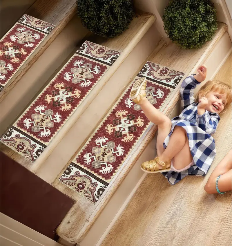 Red Medallion Printed Rug: Ethnic Design Step Rug with Geometric Pattern
