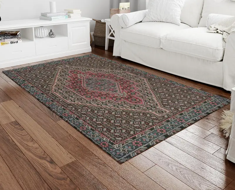 Brown Medallion Vintage Printed Rug, Turkish Design for Dining Room