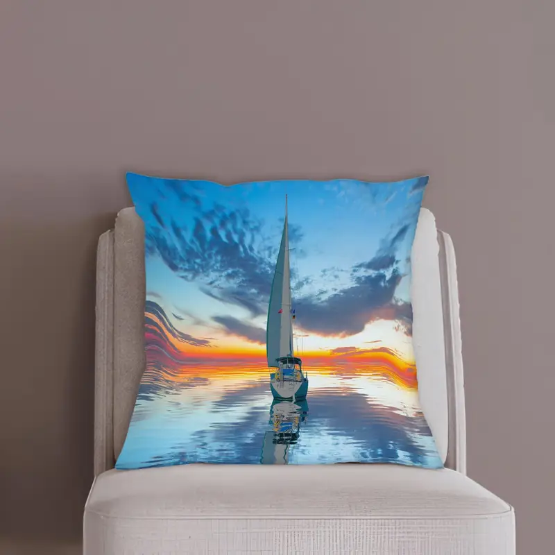 Sunset Seascape Printed Pillow: Sailing Boat & Sky Design