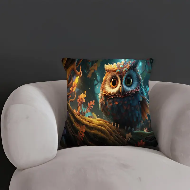 Surreal Owl Big Eyes Tree Printed Pillow - Nature Accent