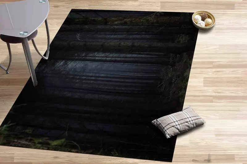 Forest Nightscape Printed Rug: Modern Black Landscape Design