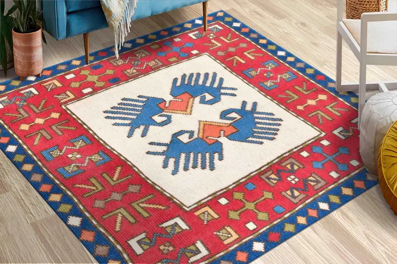 Red and Navy Blue Geometric Pattern Printed Vintage Rug