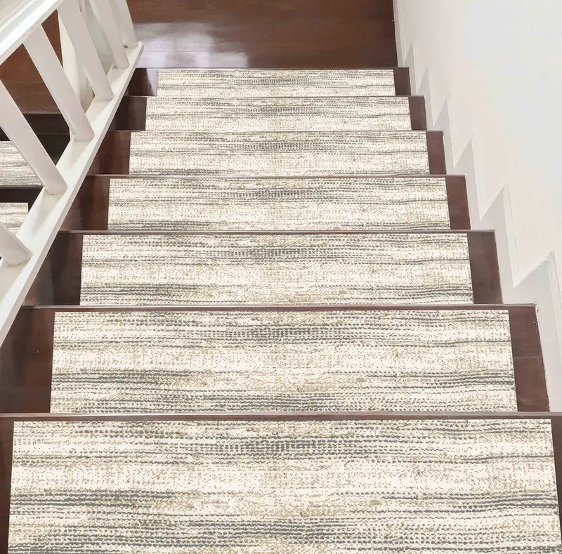 Beige Striped Printed Step Rug, Modern Ethnic Kilim Design