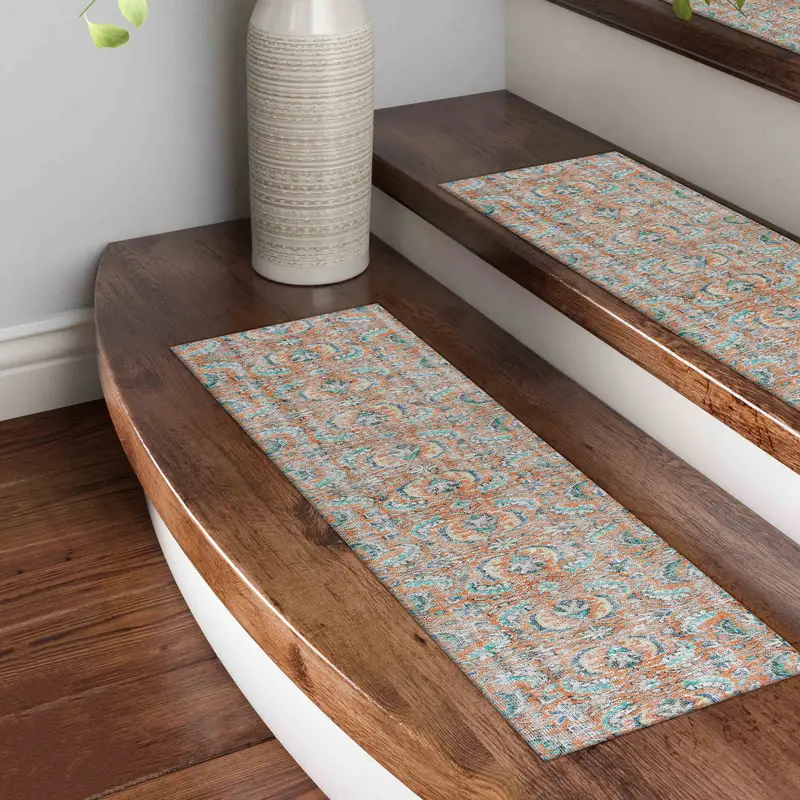 Orange Geometric Step Rug, Printed Kilim Design for Modern Homes