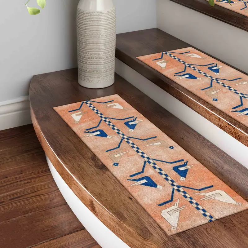 Birds Kilim Design Printed Rug - Step Rug with Beige & Blue Birds
