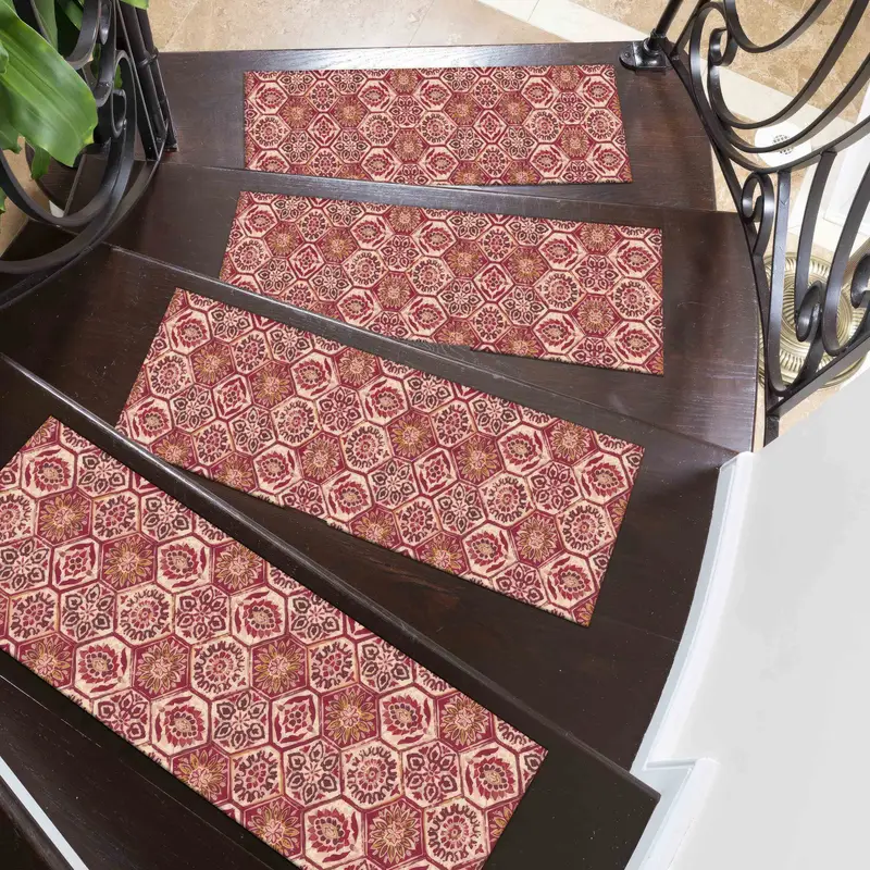 Red & Beige Floral Kilim Printed Rug for Step Area