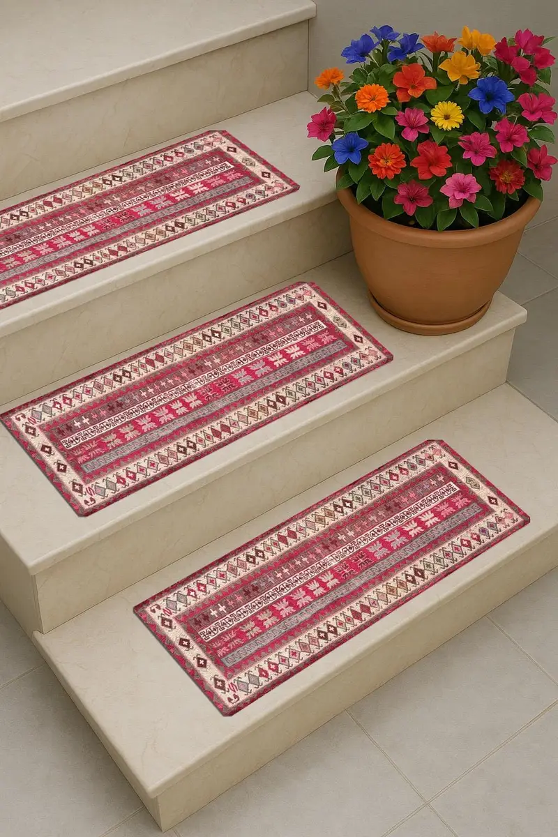 Pink Turkish Kilim Design Printed Rug with Geometric Pattern