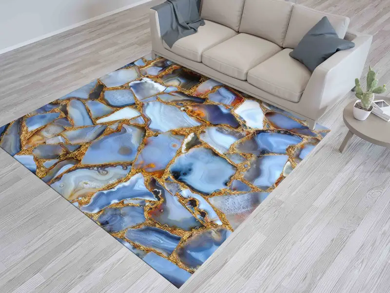 Shimmery Marble Printed Rug: Blue, Gold, Luxury Design