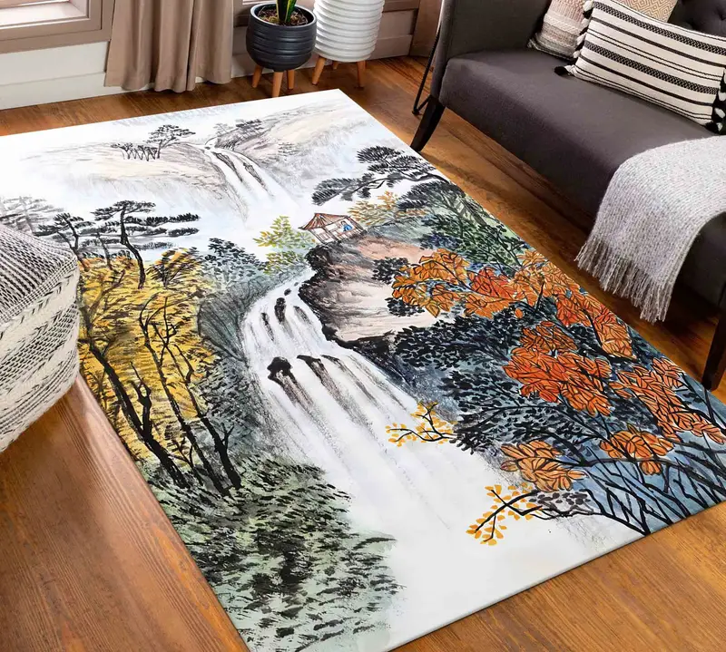 Waterfall Landscape Printed Rug: Japanese-Inspired Abstract Autumn Design